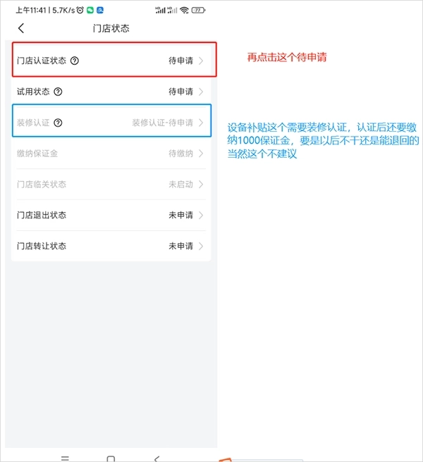 5、接下来,我们在【我的】界面中找到门店状态相关选项,选择【待申请】这一选项。