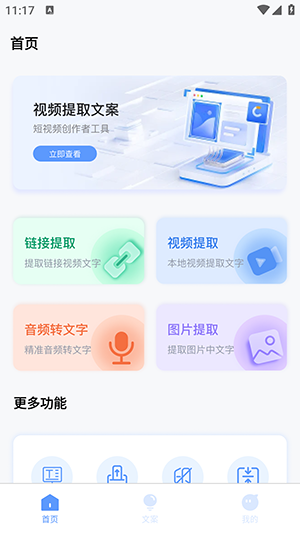 这是一款免费的视频文案提取工具,它除了能提取视频文案外,还具备链接提取、音频转文字等实用功能。你可以用它把会议录音转换成文字,轻松整理会议纪要;也能给视频添加字幕,让听障人士观看更方便;还可以将在线课程、讲座等内容录制成视频后转成文字,便于后续复习。