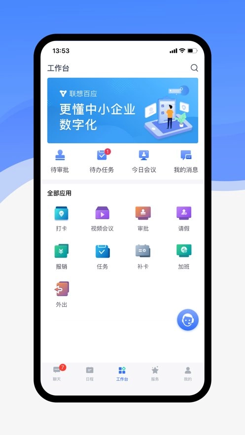 【智能工作台】助力中小企业满足日常办公所需,涵盖考勤、请假、审批中心、消息、任务、日程、报销等场景,提升企业办公效率。