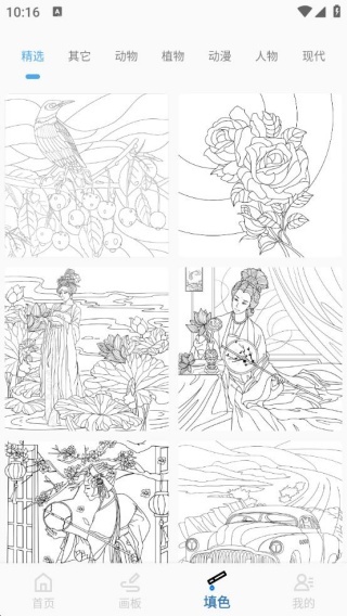 1、包含精选、动物、植物、动漫、人物、现代等各类分类,同时提供不同主题的画板模板。