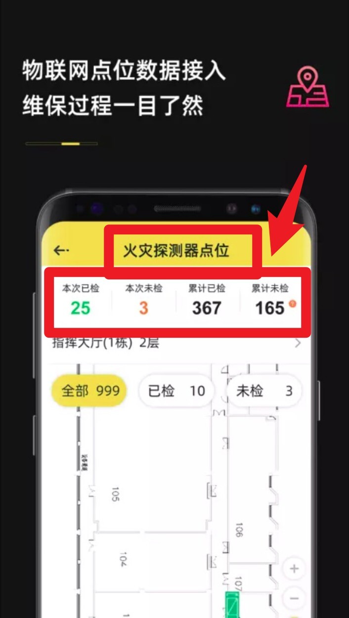 4. 于点位检查页面,能够查看各类设备的检测数据,像火灾探测器的状态等;系统还支持同步呈现检修图纸和楼层布局。