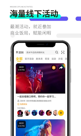这是一个专注于线下聚会的社交活动平台,你可以在这里找到志同道合的伙伴,一同去欣赏精彩演出、体验烧脑的剧本杀,或是前往周边享受露营、轰趴的乐趣,甚至有机会参与由行业大佬组织的饭局。无论是想在创业沙龙上与创业者们畅谈理想与未来,还是希望加入大佬们发起的高端活动,比如高尔夫球局、私董会等,都能在这里实现。