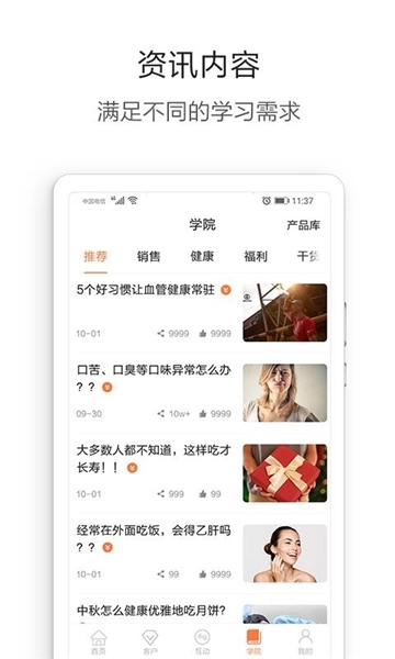 6、应用设有学院版块,用户在该版块内可浏览到销售、健康、干货等不同类别的知识内容。