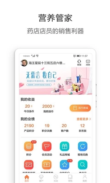 营养管家是汤臣倍健药业有限公司推出的门店专属销售管理工具,专为门店场景设计。通过它,店员能够绑定个人业绩,随时查看自己和门店的销售数据,清晰掌握经营动态。平台了专业的销售技巧培训课程,助力店员提升营销能力;还会依据所在城市特点与实际销售状况,定制专属促销活动方案,有效拉动门店销量增长。