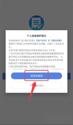 1、打开应用后,在弹出的个人信息保护指引窗口中,点击“同意并使用”按钮以确认相关协议。