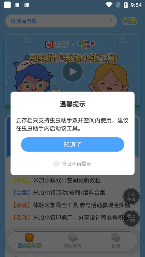 在云存档功能里,你要是发现了想玩的存档,直接点击就能使用;也能通过分类查找或者直接搜索的方式找到喜欢的存档。不过要注意,使用存档的前提是得把对应的工具和游戏都导入到虫虫助手的双开空间里才行。