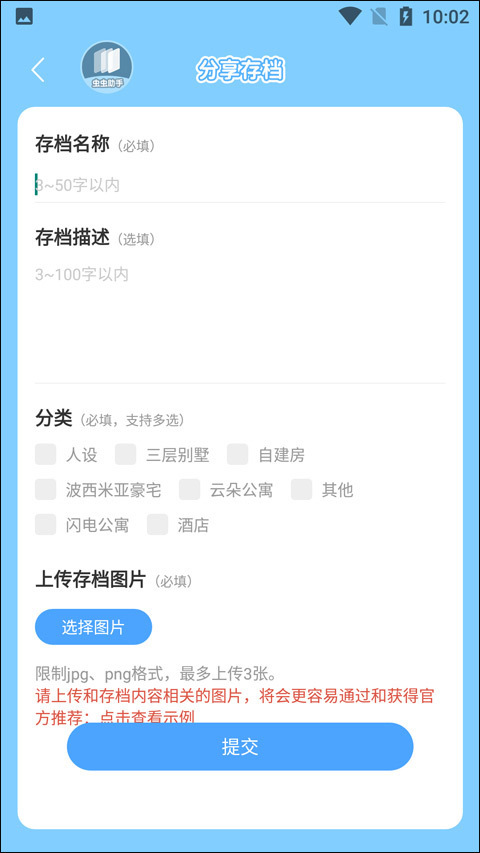 点击分享存档按钮,填写好存档的相关内容并上传对应的图片,这样就能把本地的存档分享出去啦。