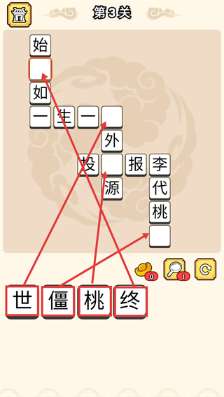 2、在第3关中,需要把【世】【僵】【桃】【终】这几个字填到对应的空位里,从而补全像【始终如一】【李代桃僵】这类成语,要是遇到困难,还能借助【提示】功能来帮助通关。