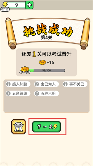 4、成功闯过第4关,得到【+16】元宝,点击【下一关】按钮进入后续关卡,还能查看已解锁的成语列表。
