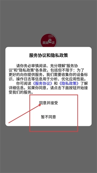 在使用【奥迪训】的相关服务前,请先阅读【服务协议】与【隐私政策】,点击【同意并接受】按钮后,就能继续体验该服务。