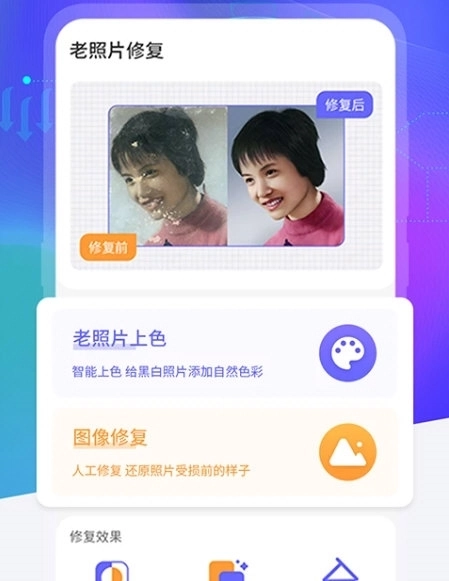 1、照片修复功能,能够对老旧照片开展色彩增强、提升清晰度等处理,让其恢复原本的面貌。