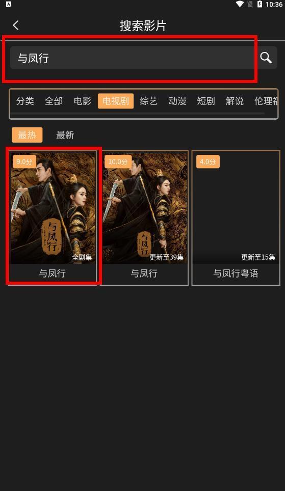 2、点击搜索框,输入你喜欢的影视剧名称进行搜索,比如《与凤行》,搜索结果出来后直接打开就能观看了。