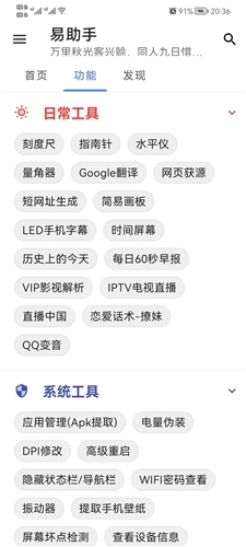 易助手是一款功能丰富的系统工具软件,众多实用功能,为用户带来诸多便利。其工具箱包含超100项功能,在同类工具软件中数量领先。软件功能划分为日常工具、系统工具、图片工具、查询工具、提取工具等八大类别。其中许多功能都十分实用,例如刻度尺、指南针、水平仪、LED手机字幕、计算器等工具,都能为用户提供便捷的服务。