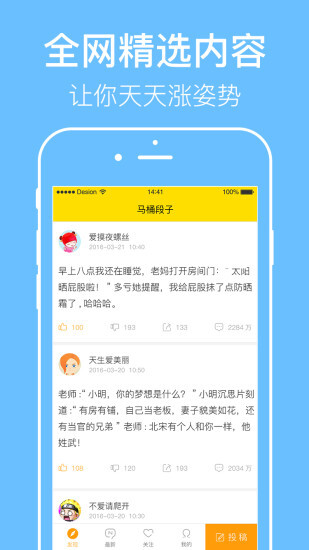 马桶段子是一款社区娱乐软件,里面有大量搞笑又充满内涵的段子,在给用户带来欢乐的同时,还能让大家增长见识。平台上汇聚了许多有趣的内容,方便你随时浏览;还有不少精彩视频可供欣赏。软件支持个性化操作,各类段子风格各异,你可以随意观看。感兴趣的朋友们不妨来体验一下吧!