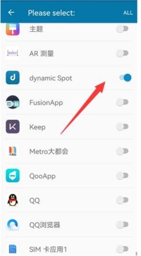 3、第三步:进入第一行后,我们要先找到【dynamicSpot】,接着打开它后面的开关。