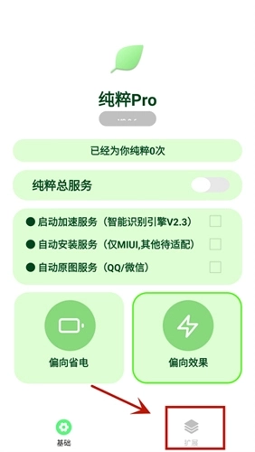 4、返回主界面,打开纯粹总服务的开关,同时勾选具备自动跳过广告功能的“启动加速服务”选项。