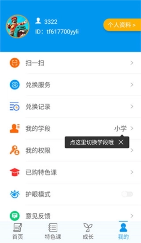 4、点击“我的”,在这个页面中,你能够查看个人的兑换课程记录以及相关权限,同时也可以对学段进行更改。