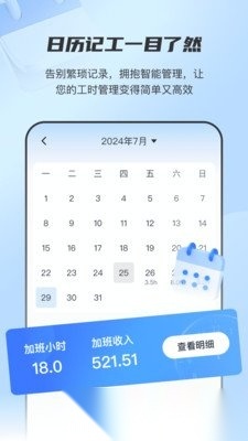 2. 设有日历页面,方便用户实时记录加班的具体日期与时长,并可随时查看因加班获得的额外收入。