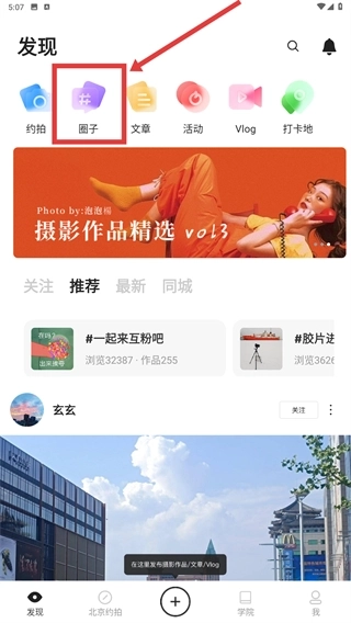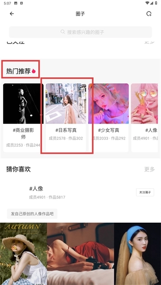 3、在圈子页面的“热门推荐”板块,挑选想要加入的目标圈子(例如【#日系写真】),点击进入该圈子的详情页面。
