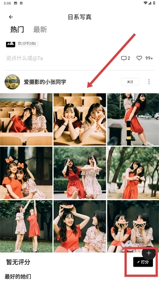 4、进入圈子详情页面后,浏览完作品内容,点击右下角的【打分】按钮,就能对该作品开展评分互动操作。
