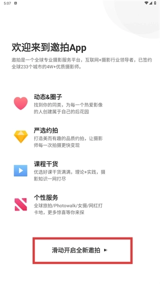 1、打开邀拍App后,在欢迎页面找到【滑动开启全新邀拍】按钮并滑动,即可进入应用的“发现”主界面。