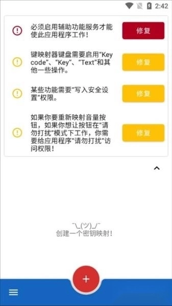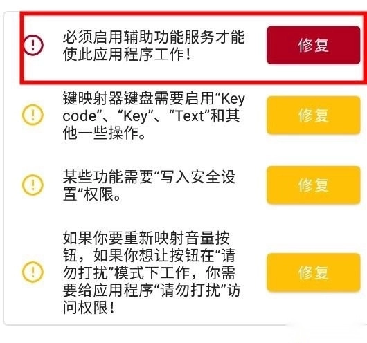 点击辅助功能服务提示旁的修复按钮,即可授予键映射器运行其辅助功能服务的权限。这是应用程序正常工作的必要操作。