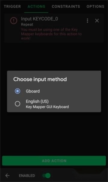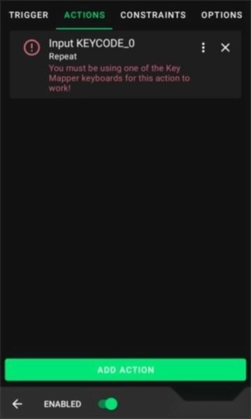 在这个简易演示里,我会从KEYCODE选项卡中挑选KEYCODE_0,这一步操作相当于模拟按下键盘上的0键。键映射器会提示你是否需要进行额外步骤才能让该操作生效。从图中能看到,操作区域有一条错误提示,提示你需要“启用”键映射器键盘。点击这个操作就能跳转到对应的设置界面,方便你解决这个问题。接下来我会讲解如何设置关键代码动作,毕竟这类动作的使用频率是最高的。