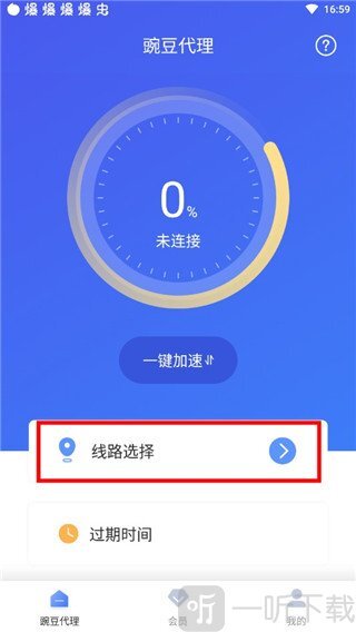 1、要是觉得当前使用的ip不够好,想换一个新的,第一步先打开应用,然后在首页找到并点击【线路选择】按钮。