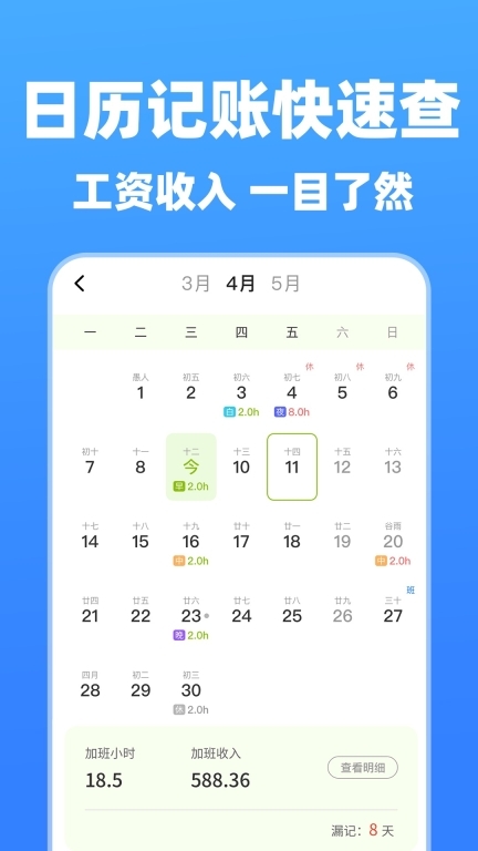 1、日历式记账查询功能,能让工资收入、加班时长清晰呈现,还会明确提醒漏记的天数。