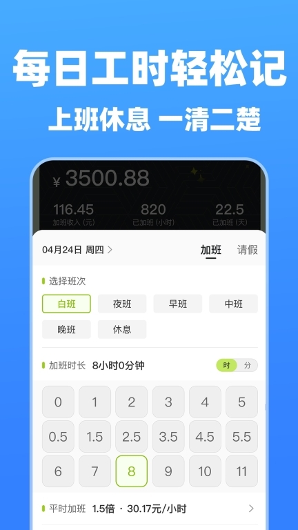 2、能够快速录入每日班次与加班时长,一键即可区分上班和休息状态,操作十分简单便捷。
