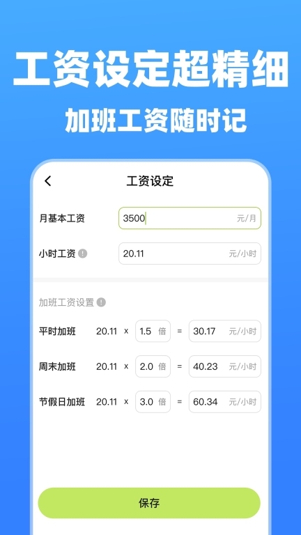 可以灵活配置月基本工资、小时工资,以及针对不同加班类型设定相应的薪资倍数。