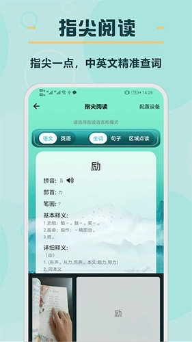 2、高效指尖翻译,手指点击任意单词时,可自动将其翻译为中文或英文。