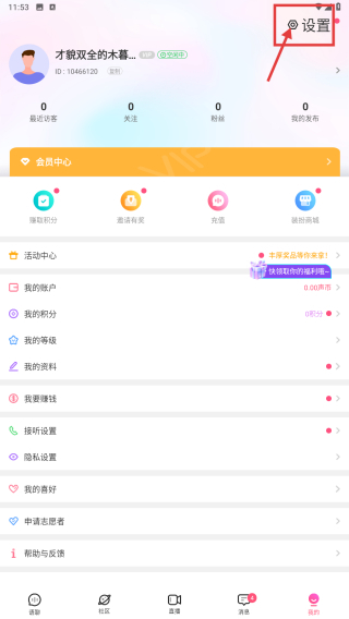 2、进入个人中心页面后,找到并点击设置选项,即可进入系统设置列表页面。