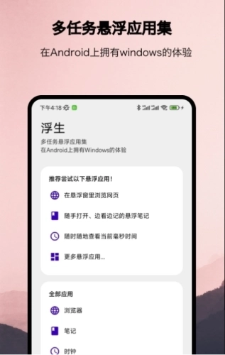 浮生是北京快乐点屏科技有限公司开发的悬浮窗任务类软件,旨在优化用户的手机操作体验。它支持多种悬浮窗任务,用户可通过设置悬浮快捷入口,快速调用悬浮窗应用;借助悬浮浏览器,能在屏幕任意位置完成看视频、搜索、翻译、查看地图等操作。该软件让用户随时随地都能快速开启功能,操作便捷、切换流畅,为手机使用带来更高效的体验。