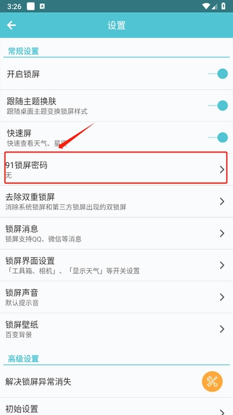 2、进入设置界面后,找到“91锁屏密码”选项并点击进入;