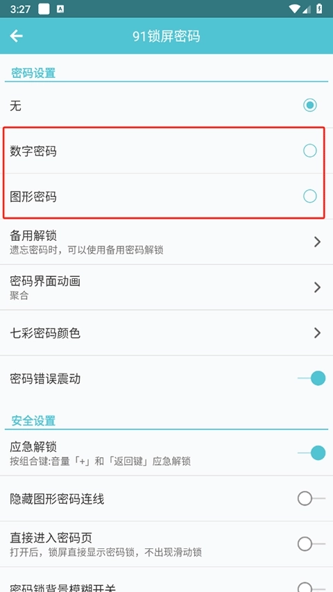 3、进入密码设置页面后,能看到数字密码与图形密码两种选项,挑选一个自己偏好的设置即可。