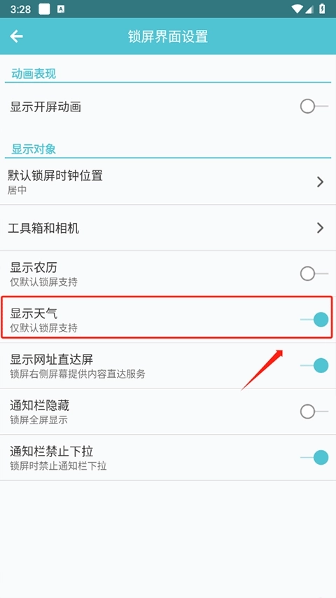 2、将显示天气功能开启即可
