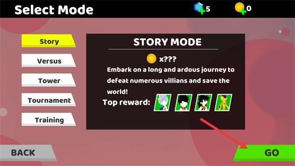 1、在【Select-Mode】界面中选中【STORY-MODE】选项,点击【GO】按钮即可开启这段冒险旅程,最终目标是战胜反派角色并赢取对应的角色奖励。