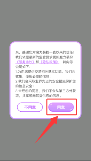 1、在服务条款和隐私政策的提示弹窗里,选择并点击确认同意的选项。
