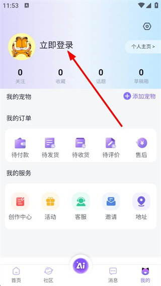 1、打开艾宠易首页后,点击页面底部的“我的”选项,即可进入个人中心页面。