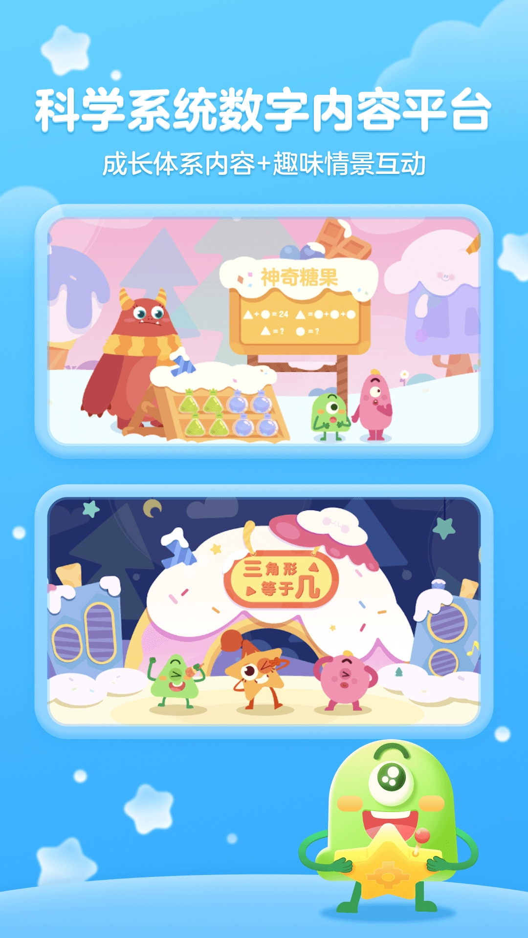 1、科学系统数字内容平台,成长体系内容+趣味情景互动;