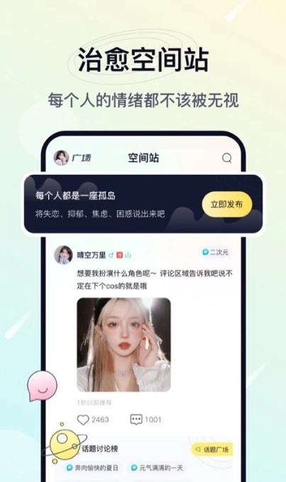 治愈星球安卓版是一个有趣且好玩的互动交友平台,在这里你可以将自己的心情、思绪与秘密,我们总会由这样和那样的烦恼,这个软件有点树洞的感觉,匿名找人来倾诉一些心里话,这个软件可以给用户提供非常好的功能,每一位想脱单互动的用户可以来体验。
