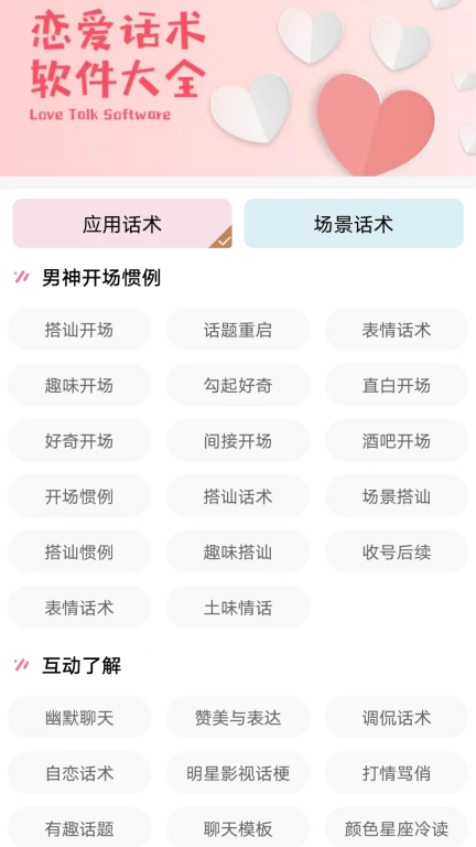 1. 初次相识:准备了初次接触时可使用的各类恋爱沟通技巧,涵盖开场方式、交流话题以及邀约方法等内容。