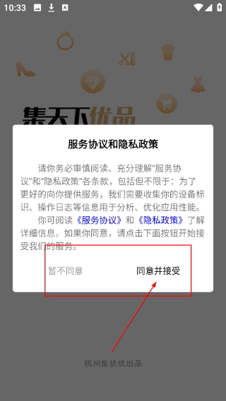1、当出现【服务协议和隐私政策】弹窗时,仔细阅读包含设备标识与操作日志相关内容的条款,随后点击【同意并接受】按钮,就能进入集天下优品的功能界面。