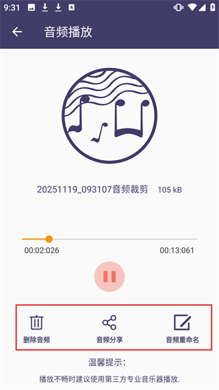 在音频播放界面,能对裁剪后的音频执行【删除音频】【音频分享】【音频重命名】等操作,还可以直接播放试听。
