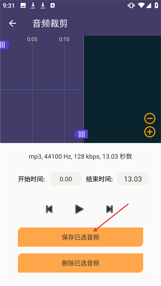3、进入音频裁剪界面后,先设置好音频的开始与结束时间,接着点击【保存已选音频】按钮,即可完成裁剪并保存该音频片段。