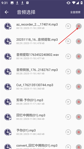 2、进入音频选择界面后,找到要裁剪的音频文件,点击该文件右侧的【裁】按钮,即可进入裁剪流程。