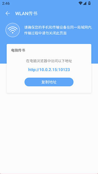3、让手机和电脑连接到同一个WiFi网络,接着在电脑的浏览器中输入界面所显示的地址,即可完成传书操作。