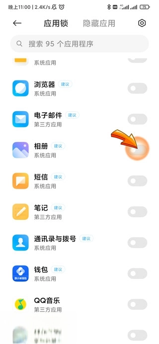 3.最后,找到“相册”应用,将开关勾选上,即可设置密码。