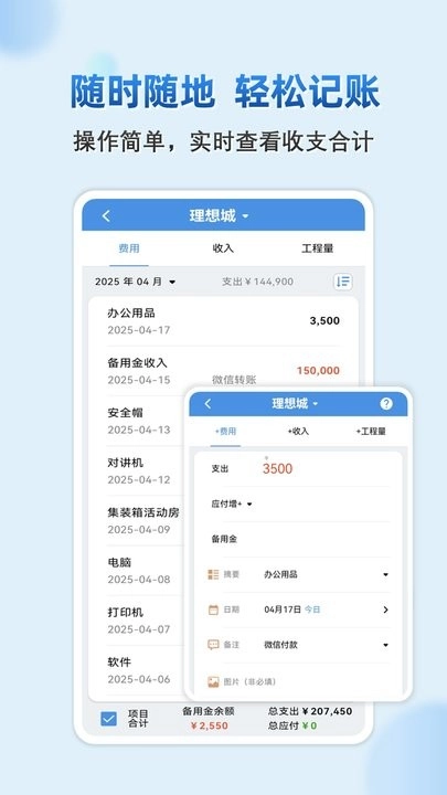 操作便捷,可随时记录费用、收入与工程量,收支统计清晰明了,直观易懂。
